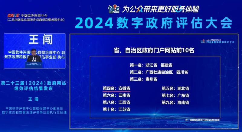 在省、自治区政府门户网站评估结果中,安徽省再次跻身全国前十,位列第4名。