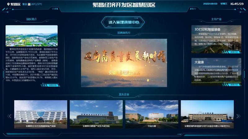 充分运用大数据、区块链、物联网、数字孪生等新兴技术,对园区综合数据进行采集、处理、分析,利用LED大屏、移动终端等设备,接入显示各瞭望点和监控端等视频数据,构建园区统一管理调度中心,实现园区一张图管理。主要包含园区总览一张图、党建一张图、产业招商一张图、项目监管一张图、经济运行一张图等内容。同时预留数据接口,实现与智慧繁昌平台的对接,支持将数据及相关模块接入智慧繁昌运营中心。